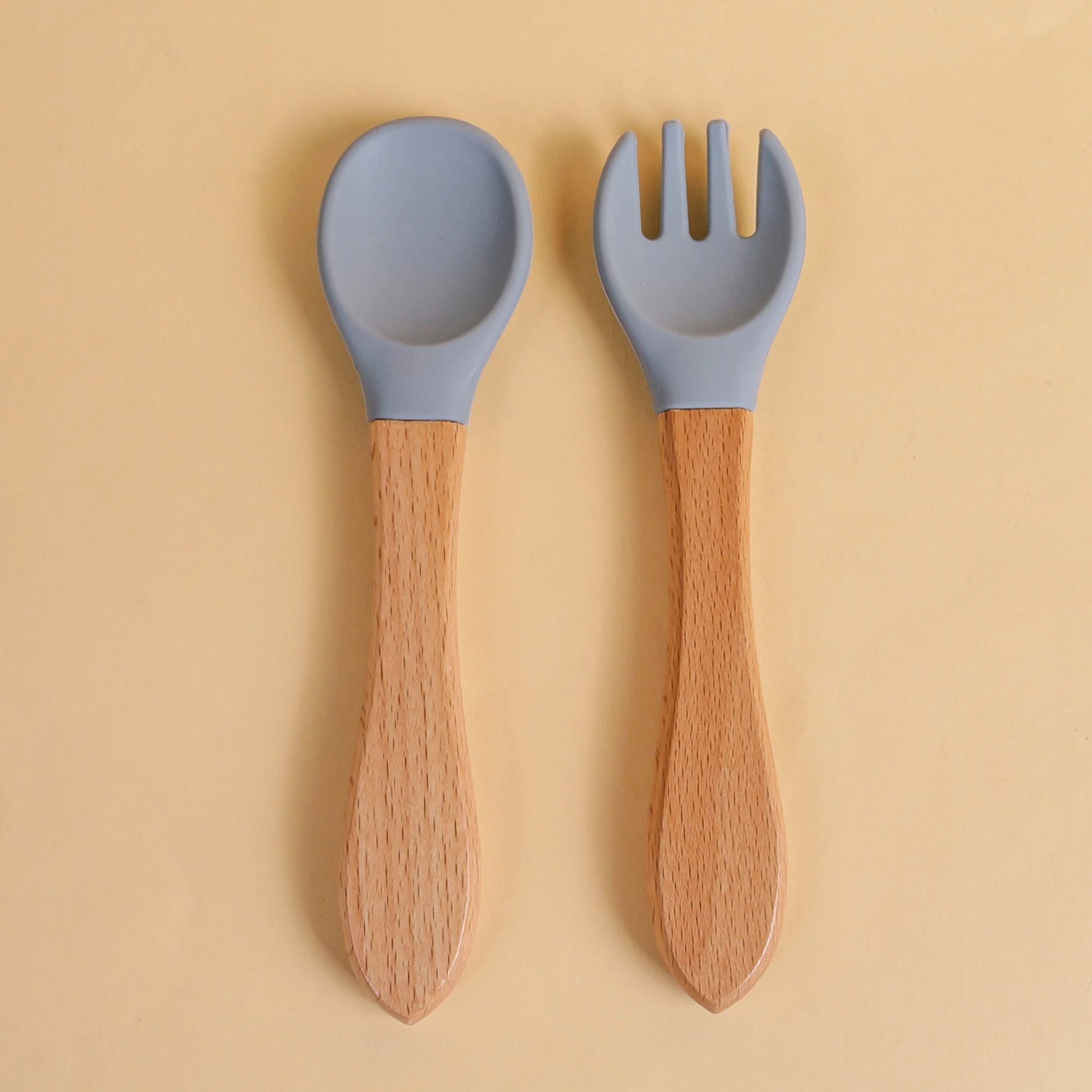 TYRY.HU 2pcs/set Tableware Baby Spoon Fork Set Children's Silicone Wooden Feeding Training Baby Dinnerware Cutlery Baby Feeding Supplies